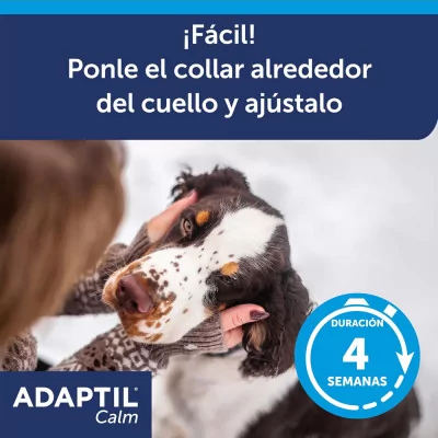 El ADAPTIL Calm Collar es una solución efectiva para perros medianos y grandes que necesitan apoyo continuo para mantenerse tranquilos en situaciones estresantes tanto en casa como en exteriores. Este collar emite feromonas calmantes que imitan las feromonas naturales de una madre perro, ayudando a tu perro a sentirse seguro y protegido en momentos de estrés, como durante los ruidos fuertes, entrenamiento, o al quedarse solo en casa.