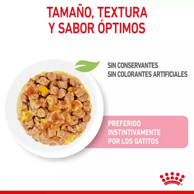 Este alimento húmedo consiste en trocitos en gelatina diseñados con un tamaño, textura y sabor óptimos, ideales para los dientes de leche de los gatitos. La suave textura de ROYAL CANIN® Kitten en gelatina facilita la masticación, promoviendo una experiencia sensorial agradable para los pequeños felinos.