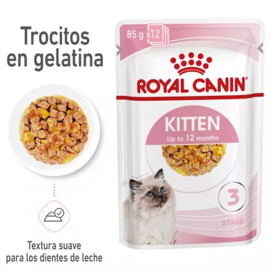 ROYAL CANIN® Kitten en gelatina está formulado específicamente para cubrir las necesidades nutricionales de los gatitos en la "fase de consolidación" de su crecimiento, un período crucial que abarca desde los 4 hasta los 12 meses. Durante esta etapa, los gatitos experimentan cambios físicos y de comportamiento significativos, lo que requiere una alimentación adaptada para apoyar su desarrollo óptimo.