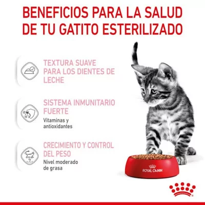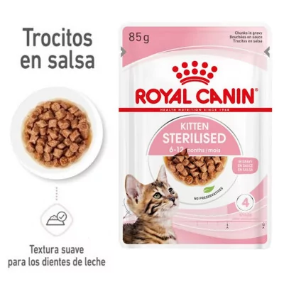 ROYAL CANIN® Sterilised Kitten en salsa está formulado para satisfacer las necesidades nutricionales específicas de los gatitos esterilizados durante la crucial "fase de consolidación" de su crecimiento, que abarca de los 6 a los 12 meses de edad. Durante este período, los gatitos experimentan importantes cambios físicos y de comportamiento, lo que hace que una alimentación adaptada sea esencial para su desarrollo óptimo.