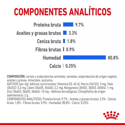Componentes Analíticos: Proteína bruta: 9,7%, Grasa bruta: 3,3%, Ceniza bruta: 1,8%, Fibra bruta: 0,9%, Humedad: 80,8%, Calcio: 0,25%.