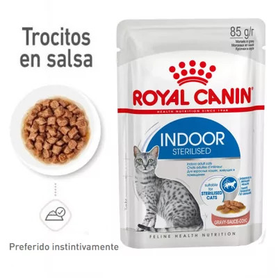 ROYAL CANIN® Indoor Sterilised in Gravy es una opción popular entre los gatos de interior. Su sabor irresistible y su textura en salsa garantizan que incluso los felinos más exigentes disfruten de su comida diaria.