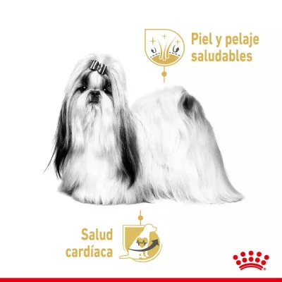 Piel y Pelaje Saludables: El Shih Tzu es conocido por su pelaje largo y denso, y mantenerlo en óptimas condiciones requiere una nutrición específica. ROYAL CANIN® Shih Tzu Adult paté está enriquecido con proteínas de alta calidad y ácidos grasos esenciales, que nutren profundamente la piel y el pelaje de tu perro. Esto contribuye a mantener una piel saludable y un pelaje brillante, además de fortalecer la barrera cutánea para protegerlo de irritaciones y problemas dérmicos.