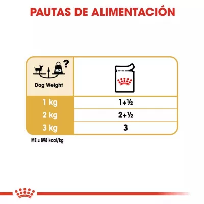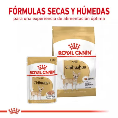 Para adaptarse a las preferencias individuales de tu perro, combina el paté con ROYAL CANIN® Chihuahua Adult disponible en formato de croquetas crujientes y sabrosas. La combinación de alimento húmedo y seco no solo añade variedad a la dieta, sino que también garantiza una nutrición completa y balanceada. Sigue las pautas de alimentación recomendadas para asegurar que tu Chihuahua recibe la cantidad adecuada de ambos alimentos.