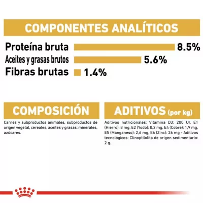 Componentes Analíticos: Proteína bruta: 8,5%, Grasa bruta: 5,6%, Ceniza bruta: 2,1%, Fibra bruta: 1,4%, Humedad: 79,0%.