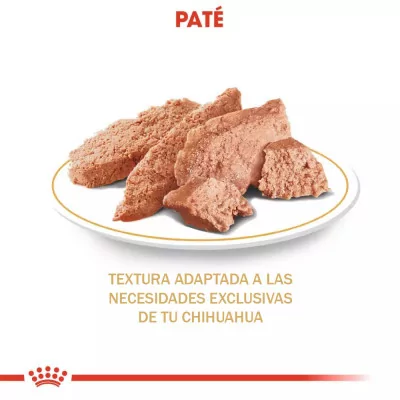 ROYAL CANIN® Chihuahua Adult paté es un alimento húmedo diseñado especialmente para cubrir las necesidades nutricionales de los Chihuahuas adultos a partir de los 8 meses de edad. Este paté ha sido formulado para mantener a tu perro sano y feliz, prestando especial atención a las particularidades de esta raza miniatura.