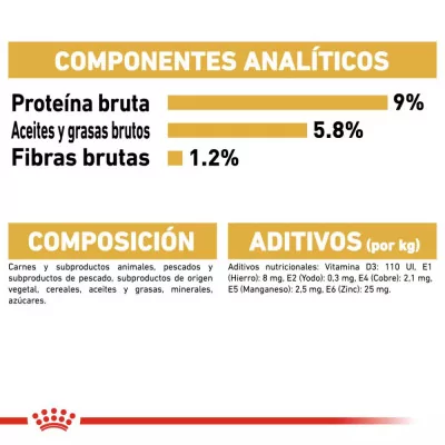 Componentes Analíticos: Proteína bruta: 9,0% - Aceites y grasas brutos: 5,8% - Ceniza bruta: 2,0% - Fibras brutas: 1,2% - Humedad: 78,5%.