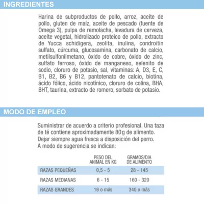 Ingredientes: Harina de subproductos de pollo, arroz, aceite de pollo, gluten de maíz, aceite de pescado (fuente de Omega 3), pulpa de remolacha, levadura de cerveza, aceite vegetal, hidrolizado proteico de pollo, extracto de Yucca schidigera, zeolita, inulina, condroitin sulfato, cúrcuma, glucosamina, carbonato de calcio, metilsulfonilmetano, óxido de cobre, óxido de zinc, sulfato ferroso, óxido de manganeso, selenito de sodio, cloruro de potasio, sal, vitaminas: A, D3, E, C, B1, B2, B6 y B12, pantotenato de calcio, biotina, ácido fólico, ácido nicotínico, cloruro de colina, BHA, BHT, taurina, extracto de romero, sorbato de potasio.