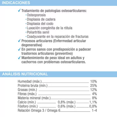 Tratamiento de patologías osteoarticulares: Osteoporosis, Displasia de cadera, Displasia de codo, Luxación congénita de la rótula, Poliartritis senil, Coadyuvante en la reparación de fracturas, Procesos articulares (Enfermedad articular degenerativa), En perros sanos con predisposición a padecer trastornos articulares (preventivo).