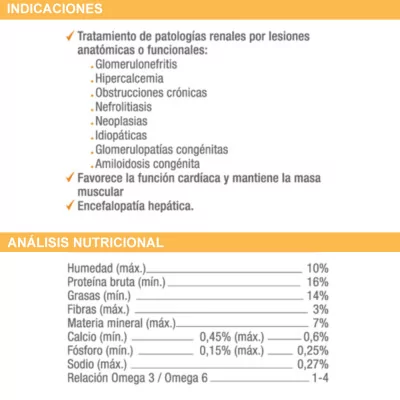 Dieta prescripta para perros adultos y gerontes que padecen enfermedad renal crónica. Su formulación permite utilizarlo para el manejo nutricional de perros con disfunción hepática.