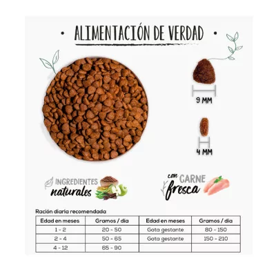 Elaborado con un 38% de carnes, incluyendo 10% de pollo fresco, este alimento garantiza proteínas de alto valor biológico, esenciales para el desarrollo muscular y la vitalidad del gatito. Además, contiene arroz integral (15%), una fuente de carbohidratos de fácil digestión que aporta energía sin generar molestias estomacales.