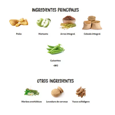 Carnes 36% (carnes deshidratadas 26%, pollo fresco* 10%), cebada integral* (10%), guisantes enteros* (9%), maíz integral* (9%), grasa de pollo, proteína de maíz, trigo integral* (7%), hidrolizado de salmón (5%), arroz integral* (2%), levadura de cerveza* (2%), proteína hidrolizada de pollo, manzana fresca* (1%), aceite de salmón, pulpa de remolacha, fructo y manano oligosacáridos, hierbas botánicas 0,02% (hinojo*, flor de manzanilla*, anís verde*), yucca schidigera. *Ingredientes naturales.