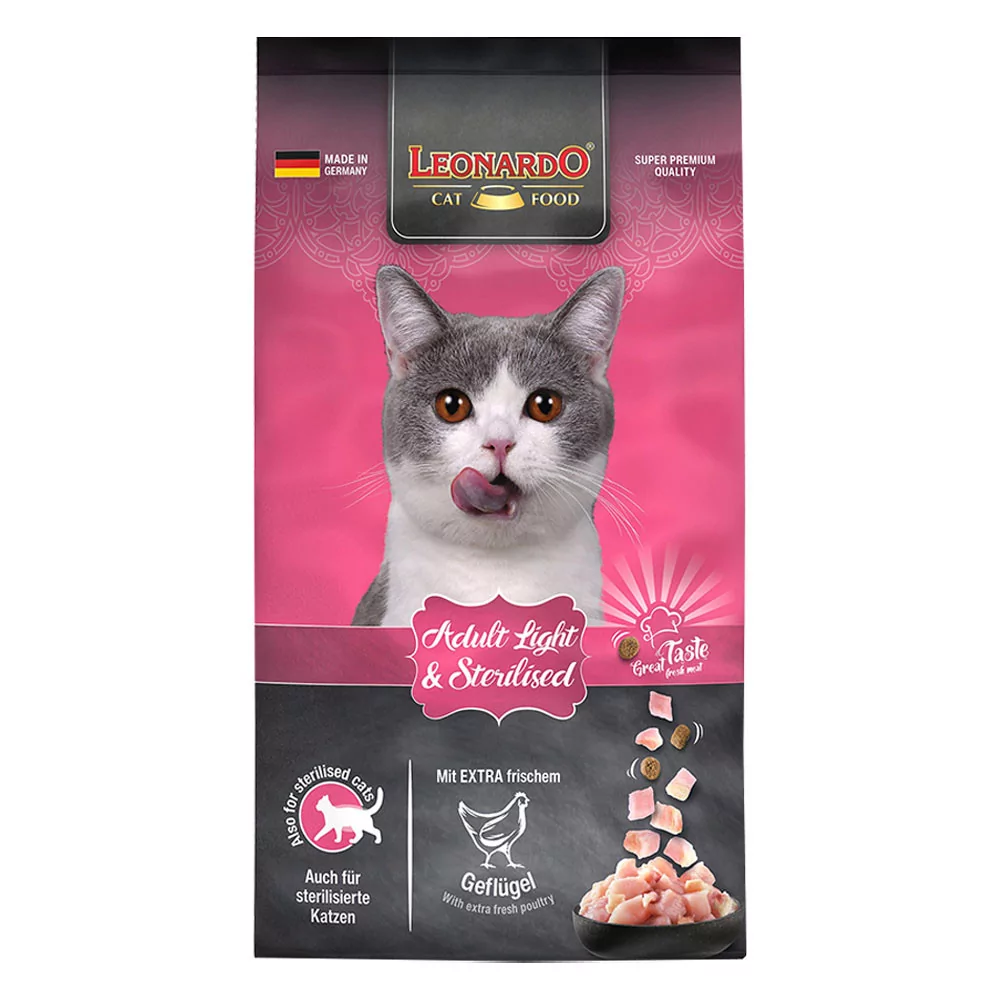 El sobrepeso en gatos puede deberse a diversos factores, como una alimentación inadecuada, el sedentarismo o los cambios hormonales tras la esterilización. Leonardo Adult Light & Sterilised ha sido desarrollado para ayudar a controlar el peso sin comprometer la nutrición ni el bienestar del gato.