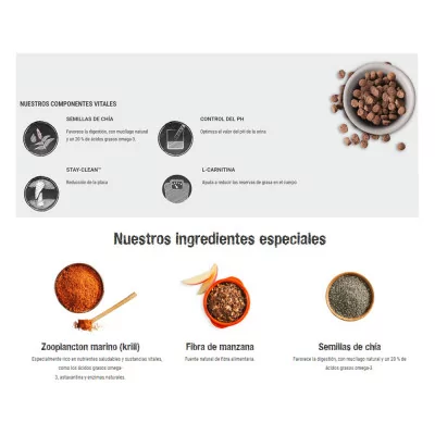 Alto en proteínas de calidad: 30% de carne de ave fresca y 23% de proteínas de ave deshidratadas.