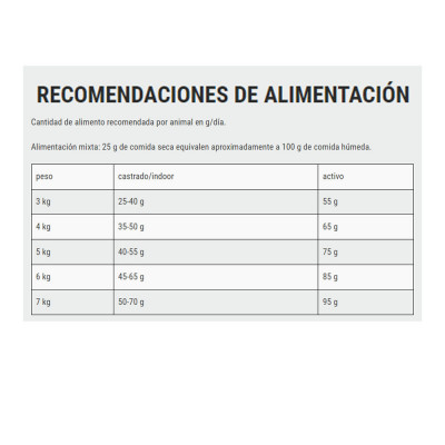 Aditivos nutricionales: vitamina A 15.000 UI; vitamina D3 1.500 UI; vitamina E 150 mg; vitamina C (como monofosfato de ascorbilo, sal sódica) 245 mg; taurina 1.400 mg; cobre (como sulfato de cobre II, pentahidrato) 15 mg; hierro (como sulfato de hierro II, monohidrato) 200 mg; manganeso (como óxido de manganeso II) 50 mg; zinc (como óxido de zinc) 150 mg; yodo (como yodato cálcico, sin agua) 2,5 mg; selenio (como selenito de sodio) 0,15 mg