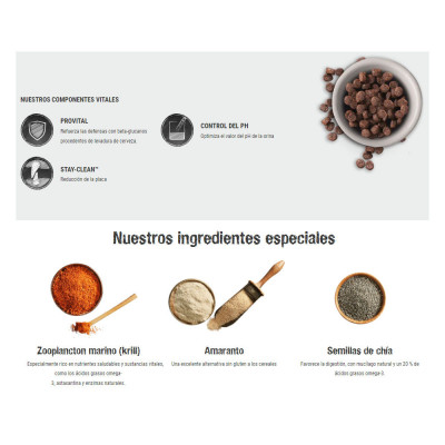Elaborado con 30% de carne fresca de ave y 22% de proteínas de ave deshidratadas, proporciona una fuente de proteínas de alta calidad para favorecer una musculatura fuerte y una energía óptima. También incluye ingredientes funcionales como krill antártico y semillas de chía, ricos en Omega-3, que contribuyen a una piel sana y un pelaje brillante.