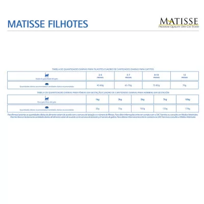La adecuada nutrición del gatito es extremadamente importante para su correcto desarrollo. Por este motivo, Matisse Filhotes fue especialmente desarrollado con los mejores ingredientes para un crecimiento saludable y equilibrado. La mezcla de ingredientes, formulados armoniosamente, garantizan el nivel calórico y proteico ideal para esta fase da vida de los gatos.