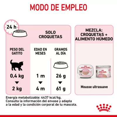 ROYAL CANIN® Mother & Babycat es un alimento especialmente formulado para satisfacer las elevadas necesidades energéticas de las gatas en la fase final de gestación y durante la lactancia, así como para apoyar el desarrollo saludable de los gatitos desde el destete hasta los 4 meses de edad.
