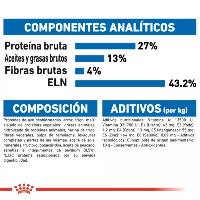 Composición: Maíz, proteínas de ave deshidratadas, arroz, aislado de proteínas vegetales, trigo, grasas animales, hidrolizado de proteínas animales, fibras vegetales, pulpa de remolacha, minerales, aceite de soja, fructo-oligosacáridos, levaduras, aceite de pescado.