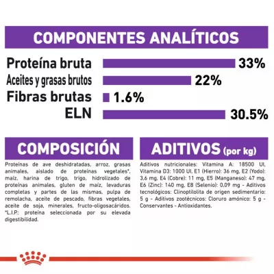 Composición: Proteínas de ave deshidratadas, arroz, grasas animales, maíz, aislado de proteínas vegetales, proteínas de cerdo deshidratadas, harina de trigo, trigo, hidrolizado de proteínas animales, gluten de maíz, levaduras completas y partes de las mismas, pulpa de remolacha, minerales, aceite de pescado, fibras vegetales, aceite de soja, fructo-oligosacáridos.