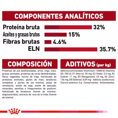 Composición: Proteínas de ave de corral deshidratadas, arroz, proteínas de cerdo deshidratadas, trigo, maíz, grasas animales, proteínas animales hidrolizadas, fibras vegetales, harina de trigo, gluten de maíz, productos de levaduras, pulpa de remolacha, sustancias minerales, aceite de soja, aceite de pescado, semillas y cáscaras de psyllium (0,5%), levaduras (fuente de manano-oligosacáridos), harina de tagetes.