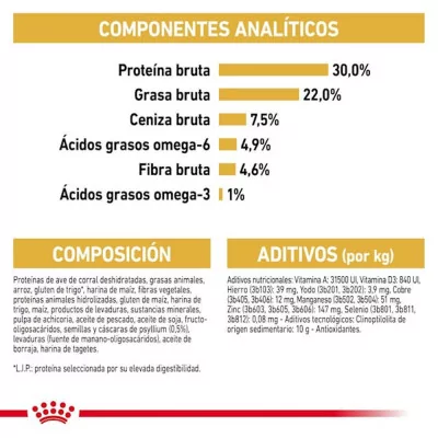 Componentes Analíticos: Proteína bruta: 30.0%, Fibra bruta: 4.6%, Grasa bruta: 22.0%, Ceniza bruta: 7.5%, Ácidos grasos omega-6: 4.9%, Ácidos grasos omega-3: 1.0%.