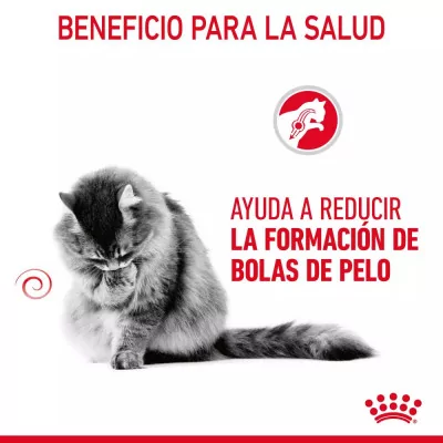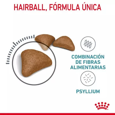 Royal Canin Hairball Care está especialmente diseñado para gatos adultos de 1 a 12 años que presentan tendencia a formar bolas de pelo debido al aseo diario. Esta fórmula nutricionalmente equilibrada utiliza un exclusivo complejo de fibras alimentarias, incluyendo psyllium, que estimulan de forma natural el tránsito intestinal. Esto permite que el pelo ingerido sea eliminado por las heces en lugar de acumularse en el estómago y causar molestias.