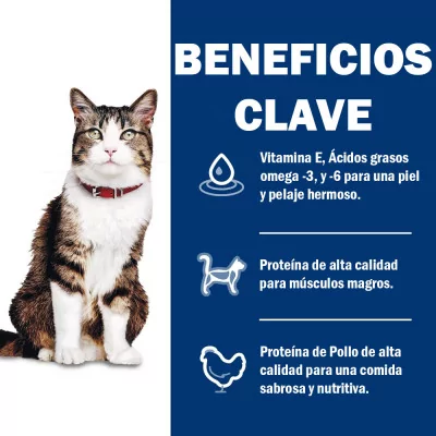 Este alimento incluye vitamina E y ácidos grasos Omega-3 y -6, que promueven una piel sana y un pelaje hermoso. La proteína de alta calidad, derivada del pollo, fomenta el desarrollo de músculos magros, mientras que su mezcla de fibras naturales favorece la digestión y facilita la eliminación natural del exceso de pelo ingerido.