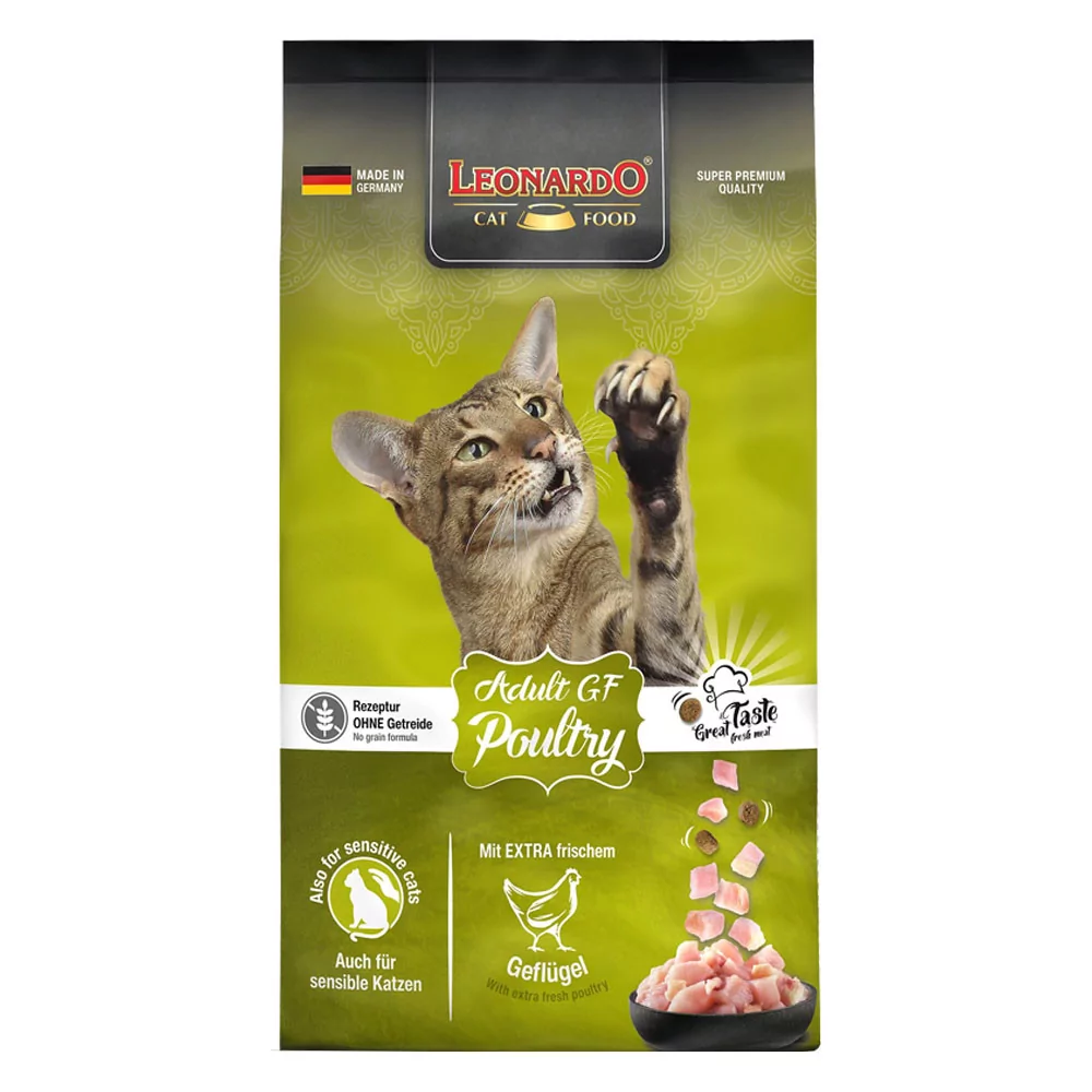 Leonardo Adult GF Poultry es un alimento super premium sin cereales ni gluten, desarrollado para gatos adultos a partir de 1 año que presentan sensibilidad digestiva o intolerancias alimentarias. En lugar de cereales, esta receta utiliza amaranto, un ingrediente altamente nutritivo y de fácil digestión, ideal para mantener una alimentación equilibrada sin comprometer la salud intestinal del gato.