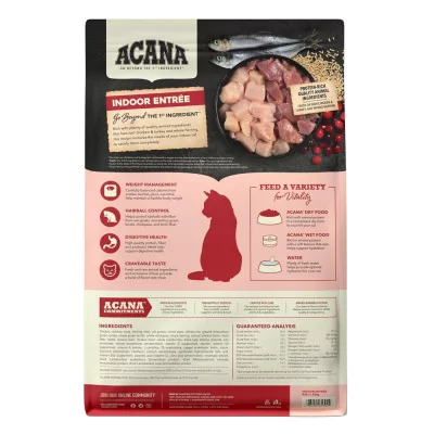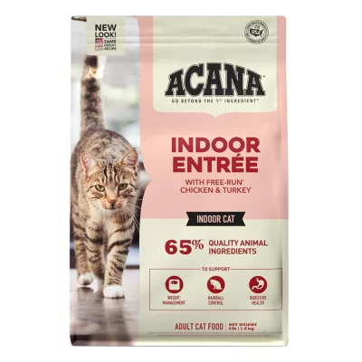 El alimento para gatos adultos ACANA™ Indoor Entrée con pollo y pavo de corral está formulado para cumplir con los niveles nutricionales establecidos por los perfiles de nutrientes de alimentos para gatos de la AAFCO para el mantenimiento de adultos.