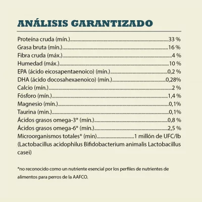 Análisis Garantizado: Proteína cruda (mín.) 33 %, Grasa bruta (mín.) 16 %, Fibra cruda (máx.) 4 %, Humedad (máx.) 10 %, EPA (ácido eicosapentaenoico) (mín.) 0,2 %, DHA (ácido docosahexaenoico) (mín.) 0,28%, Calcio (mín.) 2 %, Fósforo (mín.) 1,4 %, Magnesio (mín.) 0,1%, Taurina (min.) 0,1%, Ácidos grasos omega-3* (mín.) 0,8 %, Ácidos grasos omega-6* (mín.) 2,5 %, Microorganismos totales* (min) 1 millón de UFC/lb