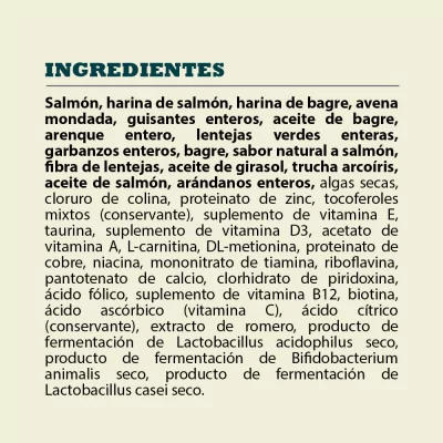 Ingredientes: Salmón, harina de salmón, harina de bagre, granos de avena, guisantes enteros, aceite de bagre, arenque entero, lentejas verdes enteras, garbanzos enteros, bagre, sabor natural a salmón, fibra de lenteja, aceite de girasol, trucha arcoíris, aceite de salmón, arándanos rojos enteros, alga marina deshidratada, cloruro de colina, proteinato de zinc, tocoferoles mixtos (conservante), suplemento de vitamina E, taurina, suplemento de vitamina D3, acetato de vitamina A, L-carnitina, DL-metionina, proteinato de cobre, niacina, mononitrato de tiamina, riboflavina, pantotenato de calcio, clorhidrato de piridoxina, ácido fólico, suplemento de vitamina B12, biotina, ácido ascórbico (vitamina C), ácido cítrico (conservante), extracto de romero, producto de fermentación de Lactobacillus acidophilus deshidratado, producto de fermentación de Bifidobacterium animalis deshidratado, producto de fermentación de Lactobacillus casei deshidratado.