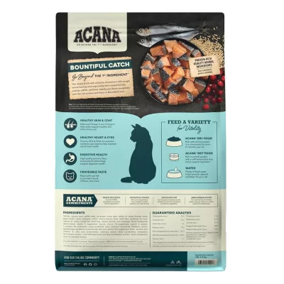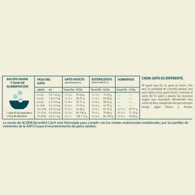 La receta de ACANA Bountiful Catch está formulada para cumplir con los niveles nutricionales establecidos por los perfiles de nutrientes de la AAFCO para el mantenimiento de gatos adultos.