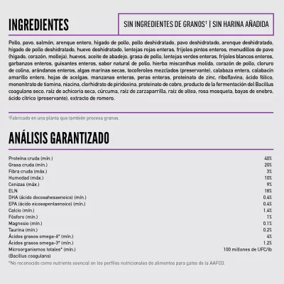 Análisis garantizado: Proteína cruda (mín.) 40%, Grasa bruta (mín.) 20%, Fibra cruda (máx.) 3%, Humedad (máx.) 10%, DHA (ácido docosahexaenoico) (mín.) 0,4%, EPA (ácido eicosapentaenoico) (mín.) 0,4%, Calcio (mín.) 1,4%, Fósforo (mín.) 1%, Magnesio (mín.) 0,1%, Taurina (mín.) 0,2%, Ácidos grasos omega-6* (mín.) 4%, Ácidos grasos omega-3* (mín.) 1,2%, Microorganismos totales* (mín.) 100 millones de UFC/lb, (Bacillus coagulans)