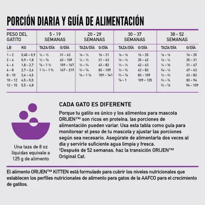 El alimento ORIJEN KITTEN está formulado para cumplir con los niveles nutricionales establecidos por los perfiles de nutrientes de alimentos para gatos de la AAFCO para el crecimiento de los gatitos.