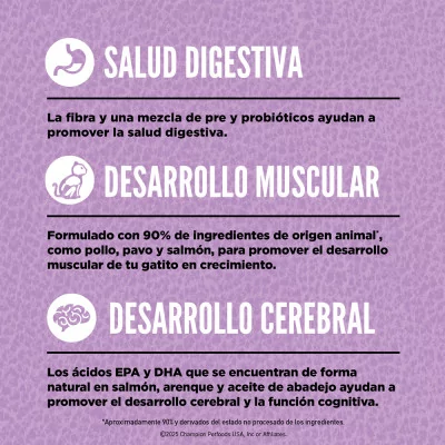 Desarrollo muscular: Formulado con un 90%* de ingredientes de origen animal como pollo, pavo y salmón para contribuir al desarrollo muscular del gatito en crecimiento.