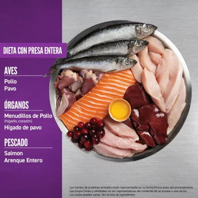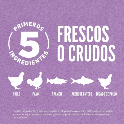 Con un 90% de ingredientes de origen animal premium, incluyendo pollo, pavo y salmón frescos o crudos.