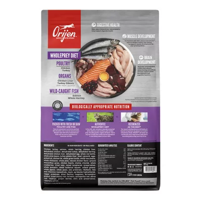 Composición: Pollo, pavo, salmón, arenque entero, hígado de pollo, pollo deshidratado, pavo deshidratado, arenque deshidratado, hígado de pollo deshidratado, huevo deshidratado, lentejas rojas enteras, frijoles pintos enteros, menudillos de pavo (hígado, corazón, molleja), huevos, aceite de abadejo, grasa de pollo, lentejas verdes enteras, frijoles blancos enteros, garbanzos enteros, guisantes enteros, sabor natural a pollo, hierba miscanthus molida, corazones de pollo, cloruro de colina, arándanos rojos enteros, algas marinas secas, tocoferoles mixtos (conservante), calabaza entera, calabaza butternut entera, col rizada, manzanas enteras, peras enteras, proteinato de zinc, riboflavina, ácido fólico, mononitrato de tiamina, niacina, clorhidrato de piridoxina, proteinato de cobre, producto de fermentación de Bacillus coagulans seco, raíz de achicoria seca, cúrcuma, raíz de zarzaparrilla, raíz de althea, escaramujos, bayas de enebro, ácido cítrico (conservante), romero extracto.