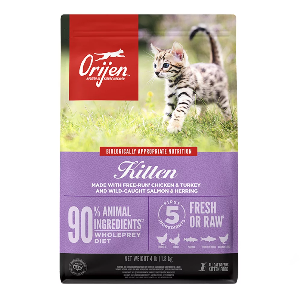 ORIJEN Kitten está especialmente formulado para cubrir las necesidades nutricionales del gato en etapa de crecimiento. Con un 90% de ingredientes de origen animal de calidad, Incluyendo pollo, pavo y salmón frescos o crudos, brinda proteínas altamente digestibles que promueven un desarrollo muscular sólido. Su mezcla de pescados ricos en DHA y EPA favorece el desarrollo cerebral y cognitivo, mientras que sus ingredientes frescos o crudos aportan nutrientes en su forma más natural y biodisponible.