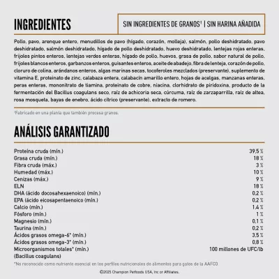 Análisis garantizado: Proteína cruda (mín.) 40%, Grasa bruta (mín.) 20%, Fibra cruda (máx.) 3%, Humedad (máx.) 10%, DHA (ácido docosahexaenoico) (mín.) 0,2%, EPA (ácido eicosapentaenoico) (mín.) 0,2%, Calcio (mín.) 1,4%, Fósforo (mín.) 1%, Magnesio (mín.) 0,1%, Taurina (mín.) 0,2%, Ácidos grasos omega-6* (mín.) 3,5%, Ácidos grasos omega-3* (mín.) 0,8%, Microorganismos totales* (mín.) 100 millones de UFC/lb, (Bacillus coagulans)