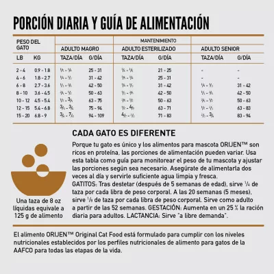 El alimento para gatos ORIJEN Original está formulado para cumplir con los niveles nutricionales establecidos por los perfiles de nutrientes de alimentos para gatos de la AAFCO para todas las etapas de la vida.