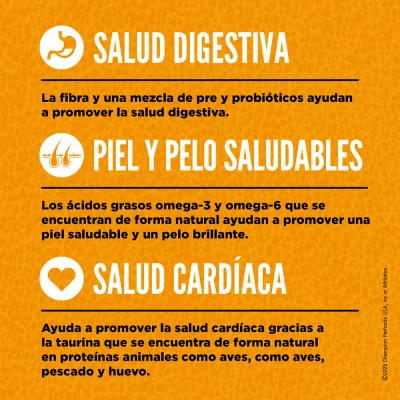 Brinda una nutrición completa que favorece la digestión, un pelaje saludable y una óptima función cardíaca.