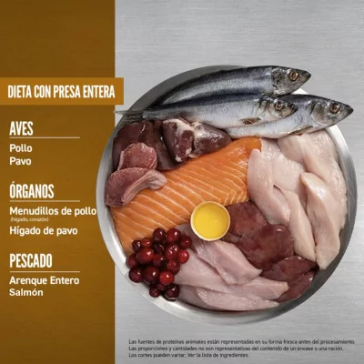Composición: Pollo, pavo, arenque entero, menudillos de pavo (hígado, corazón, molleja), salmón, pollo deshidratado, pavo deshidratado, salmón deshidratado, hígado de pollo deshidratado, huevo deshidratado, lentejas rojas enteras, frijoles pintos enteros, lentejas verdes enteras, hígado de pollo, huevos, grasa de pollo, sabor natural a pollo, frijoles blancos enteros, garbanzos enteros, guisantes enteros, aceite de abadejo, fibra de lentejas, corazones de pollo, cloruro de colina, arándanos enteros, algas marinas secas, tocoferoles mixtos (conservante), suplemento de vitamina E, proteinato de zinc, calabaza entera, calabaza moscada entera, col rizada, manzanas enteras, peras enteras, mononitrato de tiamina, proteinato de cobre, niacina, clorhidrato de piridoxina, producto de fermentación de Bacillus coagulans seco, raíz de achicoria seca, cúrcuma, raíz de zarzaparrilla, raíz de althea, escaramujos, bayas de enebro, ácido cítrico (conservante), extracto de romero.