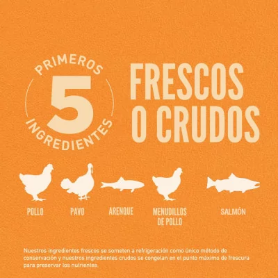 Elaborado con un 85% de ingredientes de origen animal como pollo, pavo y pescado frescos o crudos.