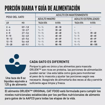 El alimento para gatos mayores ORIJEN GUARDIAN está formulado para cumplir con los niveles nutricionales establecidos por los perfiles de nutrientes de alimentos para gatos de la AAFCO para el mantenimiento de adultos.