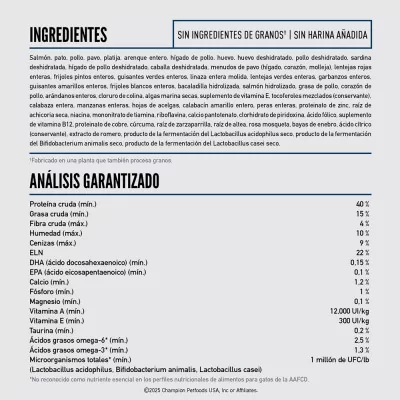 Análisis garantizado: Proteína cruda (mín.) 40%, Grasa bruta (mín.) 15%, Fibra cruda (máx.) 4%, Humedad (máx.) 10%, DHA (ácido docosahexaenoico) (mín.) 0,15%, EPA (ácido eicosapentaenoico) (mín.) 0,1%, Calcio (mín.) 1,2%, Fósforo (mín.) 1%, Magnesio (mín.) 0,1%, Vitamina A (mín.) 12.000 UI/kg, Vitamina E (mín.) 300 UI/kg, Taurina (mín.) 0,2%, Ácidos grasos omega-6* (mín.) 2,5%, Ácidos grasos omega-3* (mín.) 1,3%, Microorganismos totales* (mín.) 1 millón de UFC/lb. (Lactobacillus acidophilus Bifidobacterium animalis Lactobacillus casei)