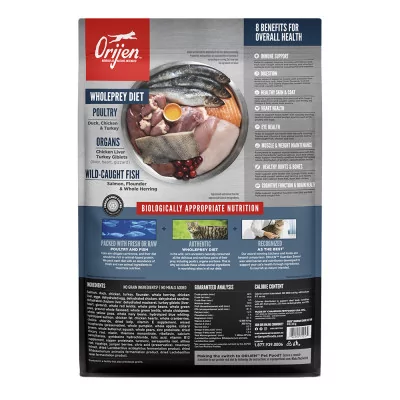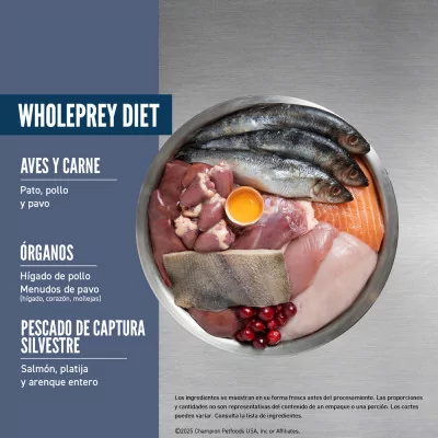 Composición: Salmón, pato, pollo, pavo, lenguado, arenque entero, hígado de pollo, huevos, huevo deshidratado, pollo deshidratado, sardina deshidratada, hígado de pollo deshidratado, caballa deshidratada, menudillos de pavo (hígado, corazón, molleja), lentejas rojas enteras, frijoles pintos enteros, guisantes verdes enteros, linaza molida, lentejas verdes enteras, garbanzos enteros, guisantes amarillos enteros, frijoles blancos enteros, bacaladilla hidrolizada, salmón hidrolizado, grasa de pollo, corazones de pollo, arándanos rojos enteros, cloruro de colina, algas marinas secas, suplemento de vitamina E, tocoferoles mixtos (conservante), calabaza entera, manzanas enteras, berza, calabaza moscada entera, peras enteras, proteinato de zinc, raíz de achicoria seca, niacina, mononitrato de tiamina, riboflavina, pantotenato de calcio, hidrocloruro de piridoxina, ácido fólico, suplemento de vitamina B12, proteinato de cobre, cúrcuma, raíz de zarzaparrilla, raíz de malvavisco, escaramujos, bayas de enebro, ácido cítrico (conservante), extracto de romero, producto de fermentación de Lactobacillus acidophilus seco, producto de fermentación de Bifidobacterium animalis seco, producto de fermentación de Lactobacillus casei seco.
