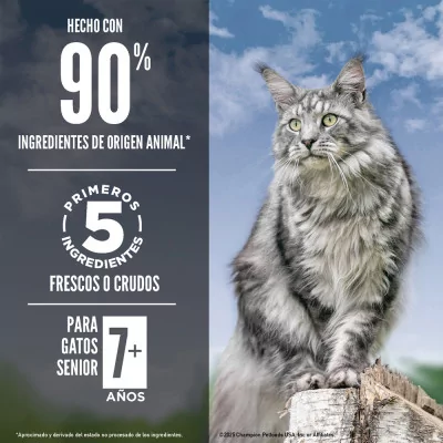 Con un 90% de ingredientes de origen animal, esta dieta ayuda a mantener la vitalidad, la energía y el bienestar general de tu gato senior, favoreciendo sus funciones digestivas, cardiovasculares, cognitivas, musculares y articulares en esta etapa de vida.