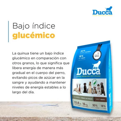Ducca Adulto Super Premium es un alimento completo y equilibrado diseñado para perros adultos de todas las razas. Su fórmula hipoalergénica a base de carne de res y quinua aporta proteínas de alta calidad y nutrientes esenciales para mantener una óptima condición física.