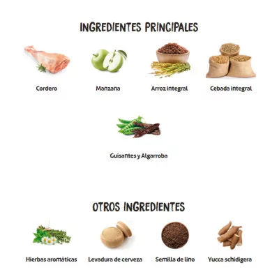 Composición: Carnes 30% (carnes deshidratadas 20%, cordero fresco* 10% antes de la extrusión), arroz integral* (15%), cebada integral* (10%), grasa de pollo, trigo integral* (9%), maíz integral* (8%), guisantes enteros* (5%), salvado de trigo* (5%), garrofa* (2%), manzana* (1%), aceite de salmón, semilla de lino* (1%), pulpa de remolacha, fructo y manano oligosacáridos, levadura de cerveza* (0,5%), plantas aromáticas 0,02% (hinojo*, equinácea*, tomillo*), yucca schidigera.*INGREDIENTES NATURALES